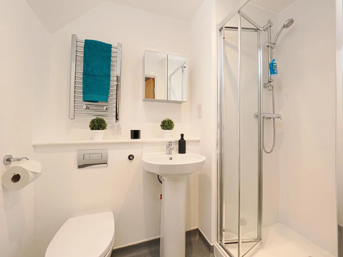 Facilities include: Electric ceramic hob, oven, microwave, Breakfast bar/dining area with bar stool, heated towel rail, electric shower, landscaped courtyard and social areas, bicycle racks. For your safety there is keyless electronic door entry system, CCTV, monitored fire alarm and sprinkler system, dusk ‘til dawn courtyard lighting.