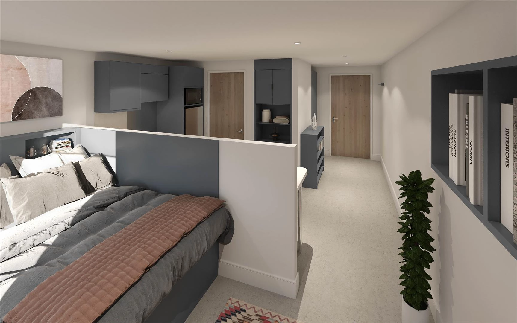 A stylish, one bed studio apartment, fully equipped with a modern kitchen, separate study space, king size bed, plenty of storage and en-suite shower room.