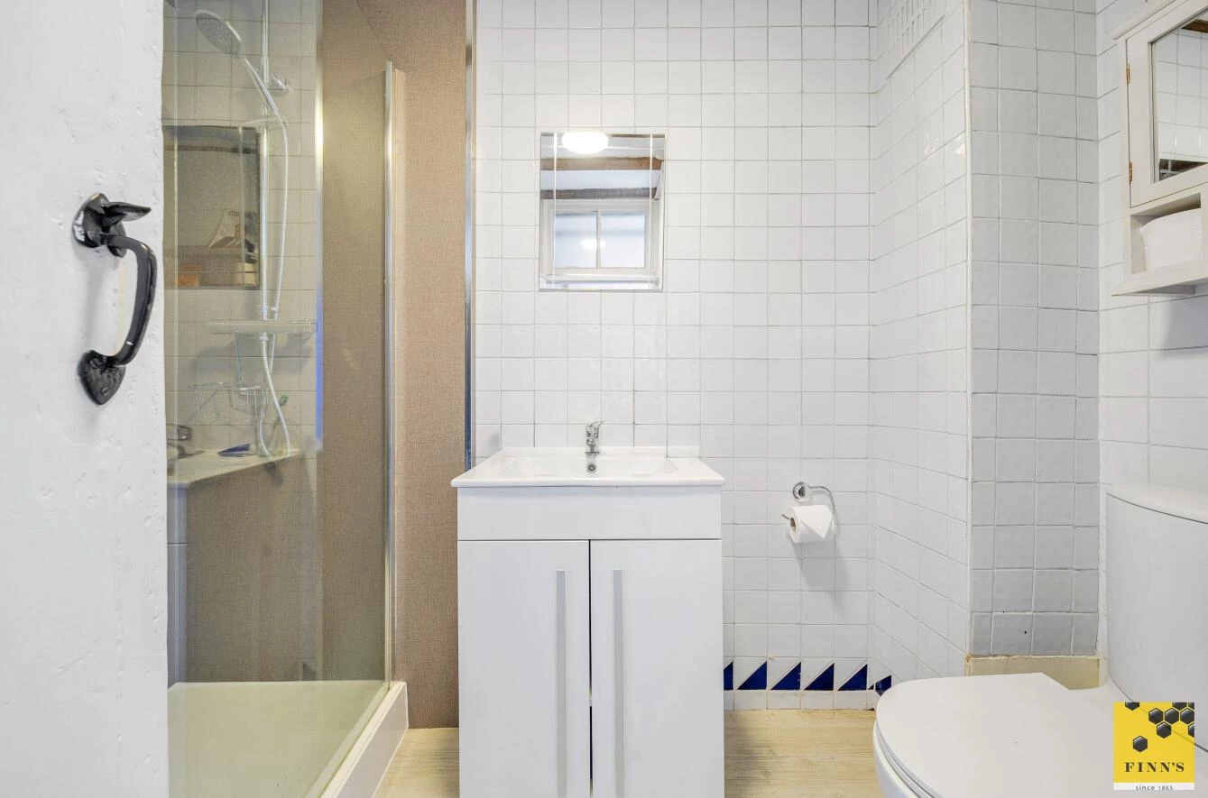 On the first floor, the landing leads to a charming second bedroom at the front of the house, featuring period wall panelling, an ornamental fireplace, and an exposed chimney breast. A shower room completes this floor.