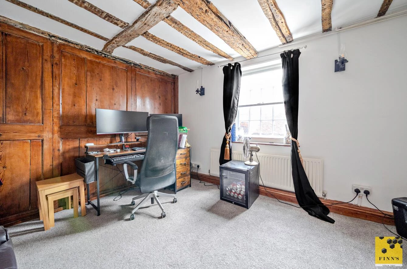 The second floor boasts a stunning main bedroom with exposed beams, chimney breast and wonderful Cathedral views to the front.