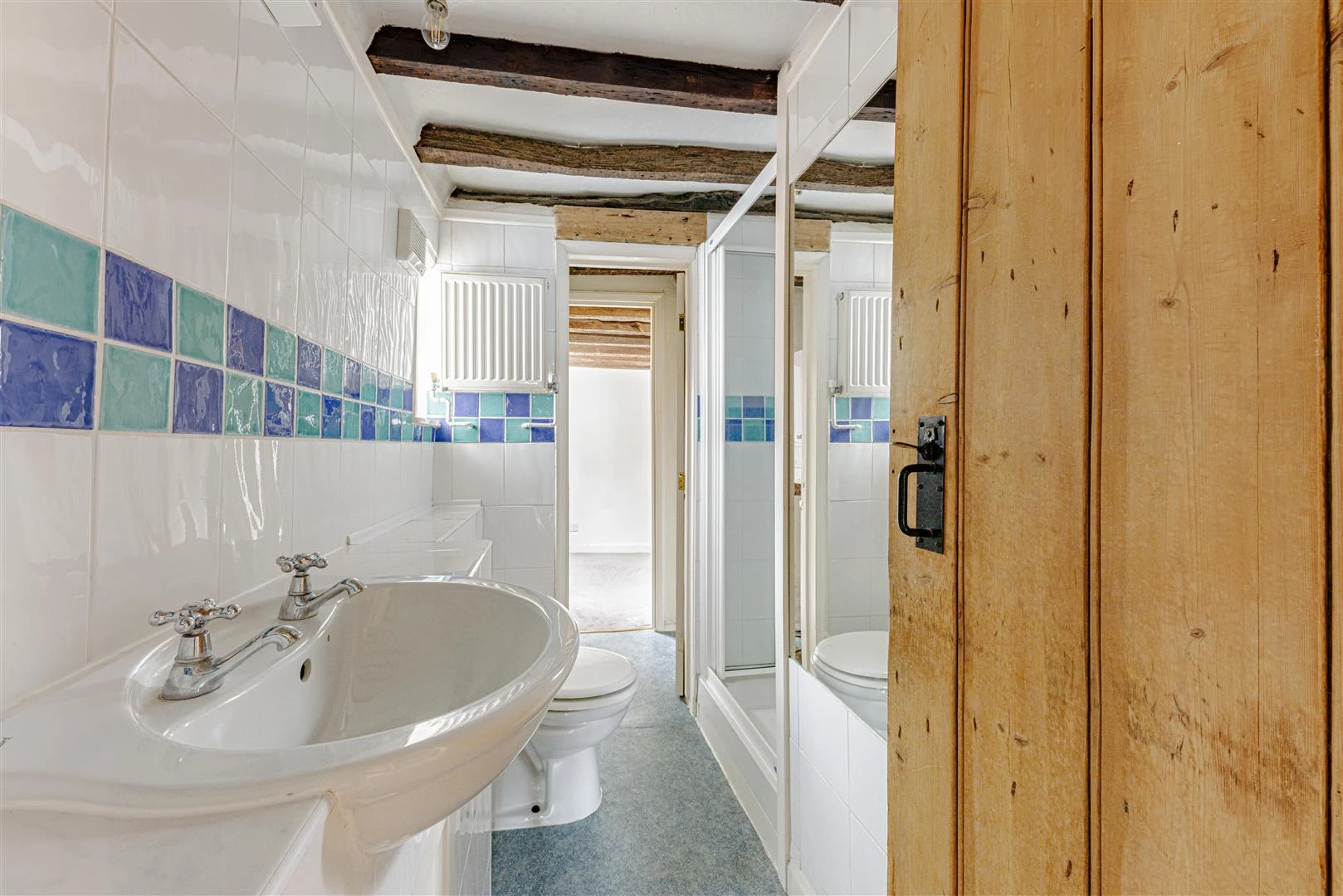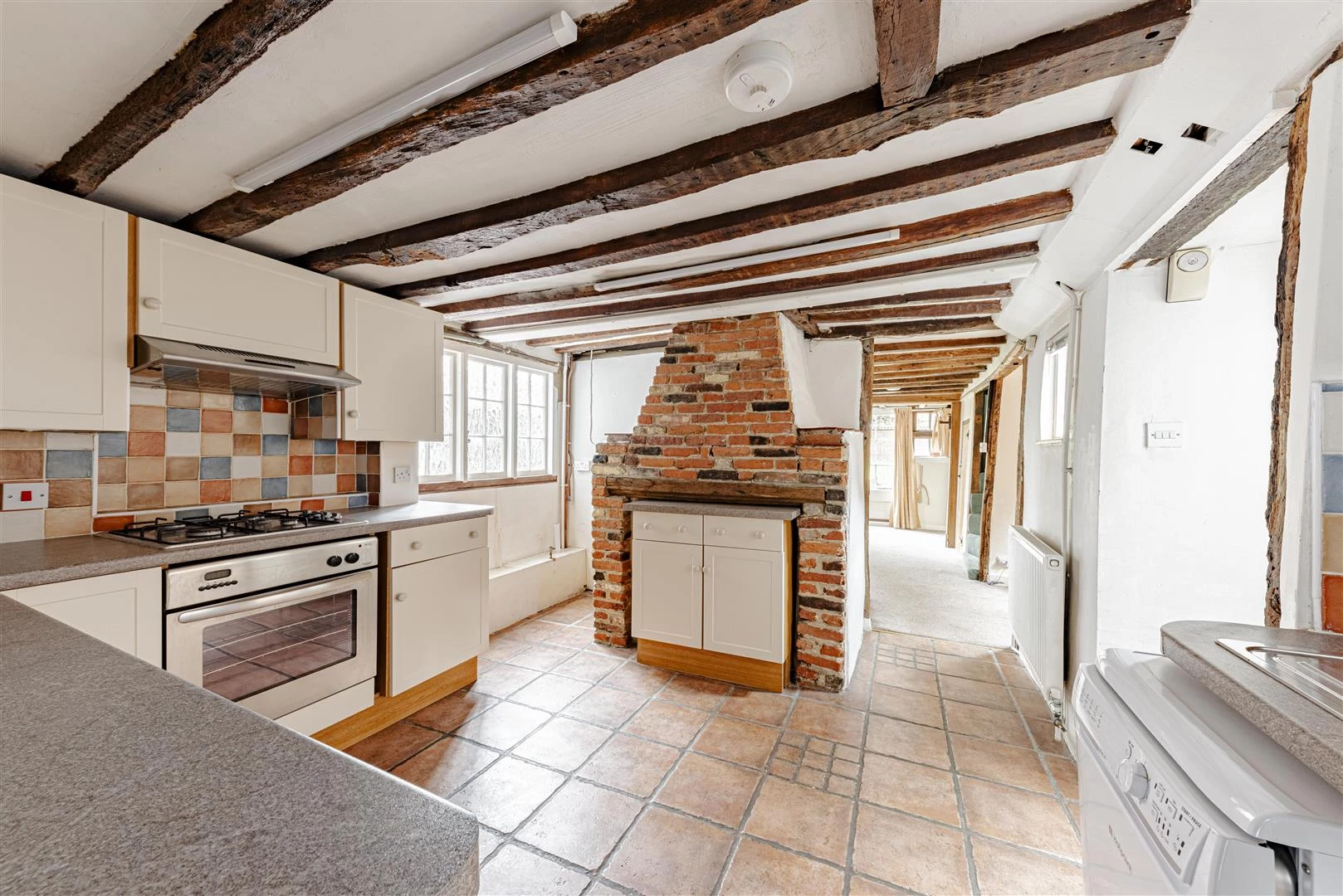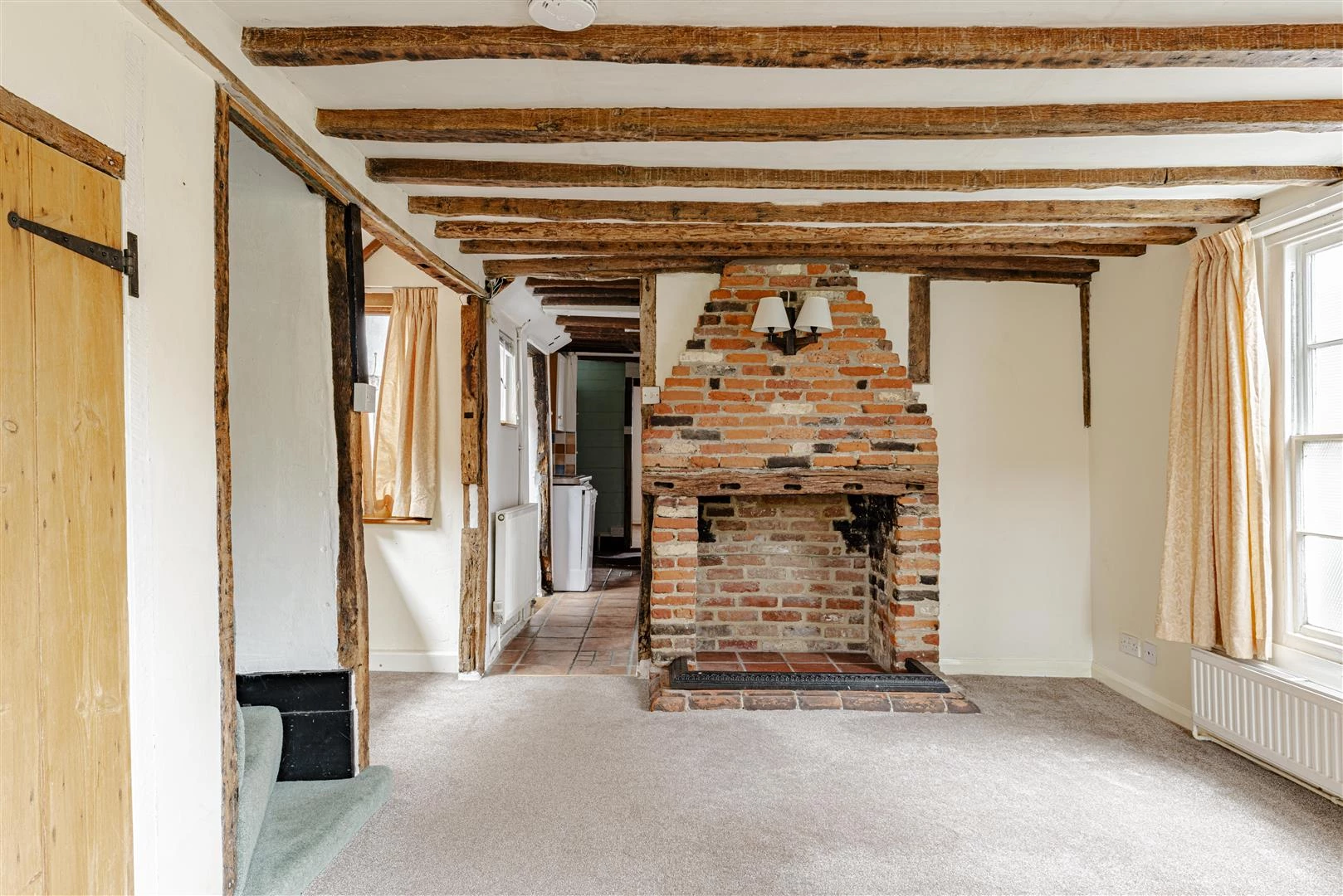 The cottage is approached through a passage between No. 41 and The Old Hall, with a side entrance opening directly into the kitchen. Fitted with a range of wall and base units and space for appliances, already fitted, the kitchen also features an inglenook fireplace. From the kitchen to the rear is the sitting room offering a cosy retreat with inglenook fireplace. French doors open onto a good sized patio and the garden beyond. At the front of the cottage, the dining room is full of old world atmosphere, with a ceiling of heavily exposed beams possibly reclaimed from ancient sailing ships.