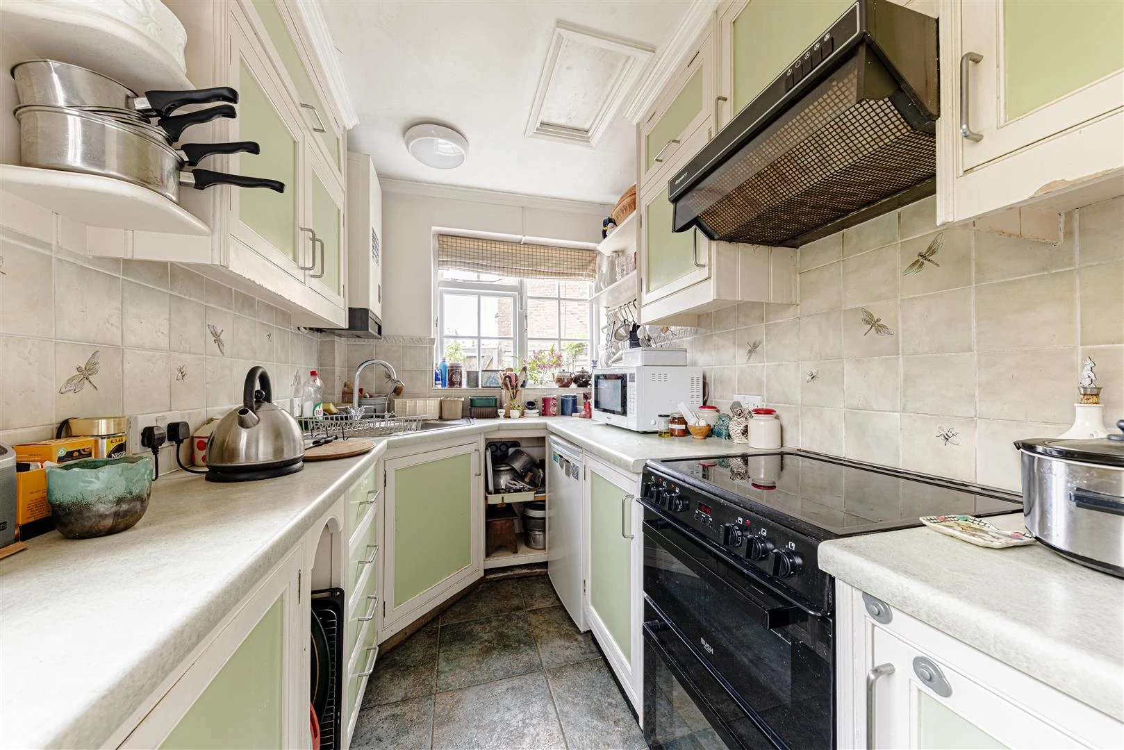 Upon entering, a small vestibule with charming stained glass accents leads into a generous sitting room & dining room. This elegant space boasts an open fireplace, bespoke built-in shelving and bookcases, and ample room for a dining table near the adjoining kitchen. To the rear, the galley-style kitchen enjoys dual aspect windows and is fitted with a range of wall and base units, along with access to the rear garden. There is a downstairs cloakroom with shower conveniently tucked away behind a sliding door.