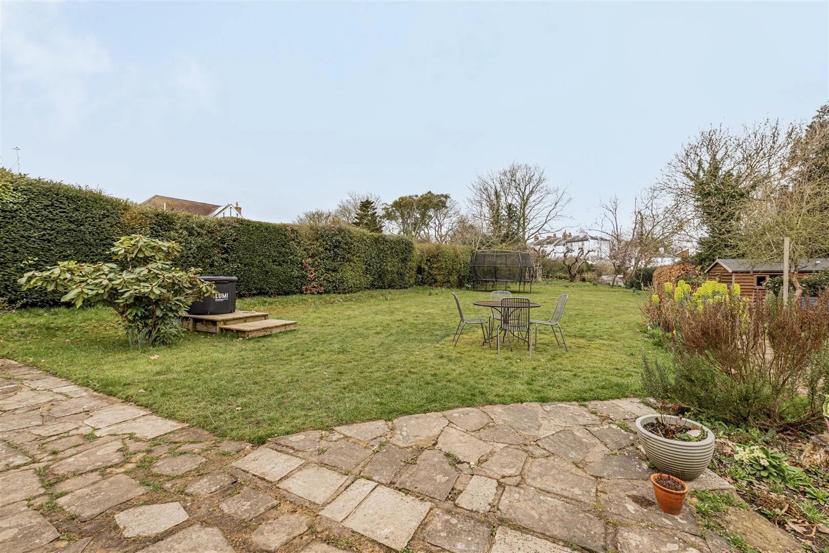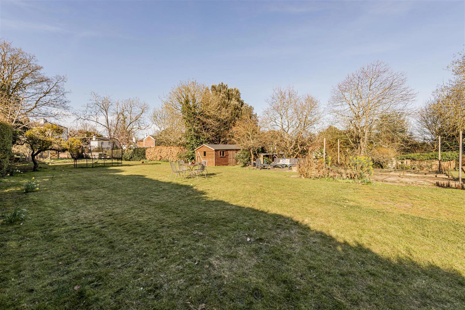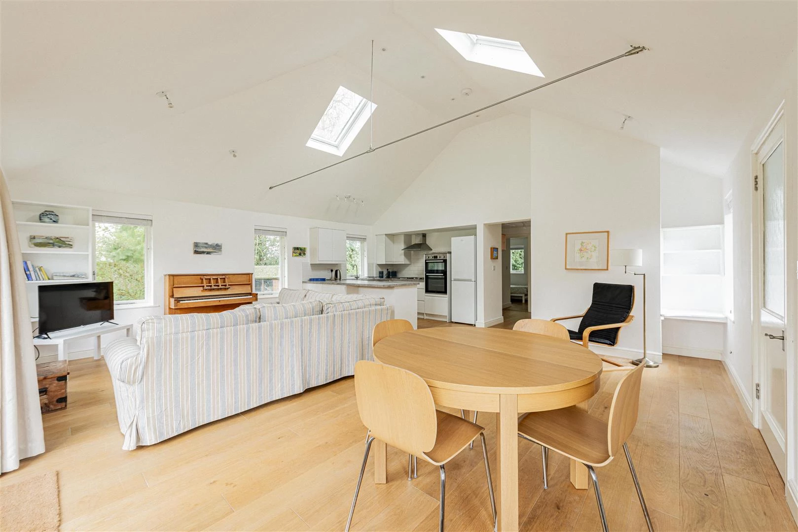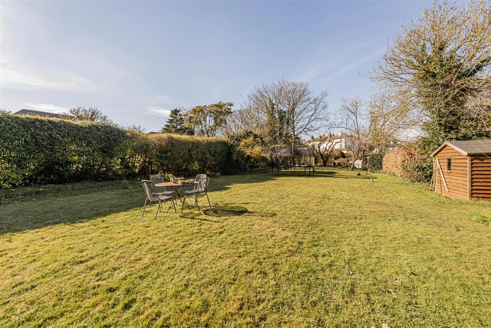 The detached annexe offers a contemporary, bright open-plan living area with a sitting room, dining room and kitchen. Its vaulted ceiling with Velux windows floods the space with natural light. The annexe has two bedrooms, including one with an en-suite shower room, and a family shower room, making it an ideal independent living space. The beautifully maintained gardens offer a private and peaceful retreat.