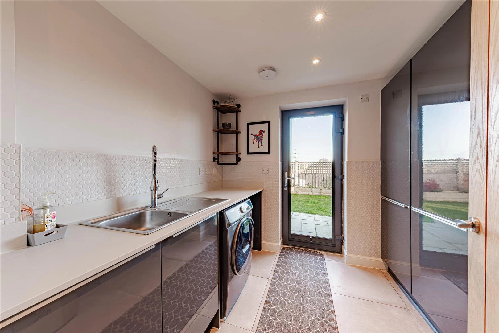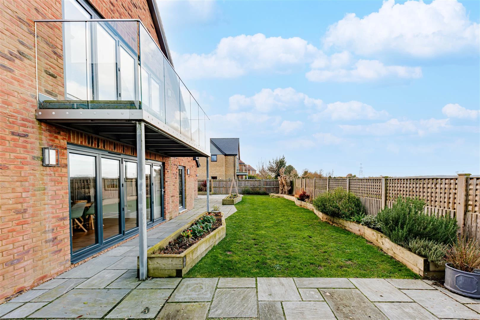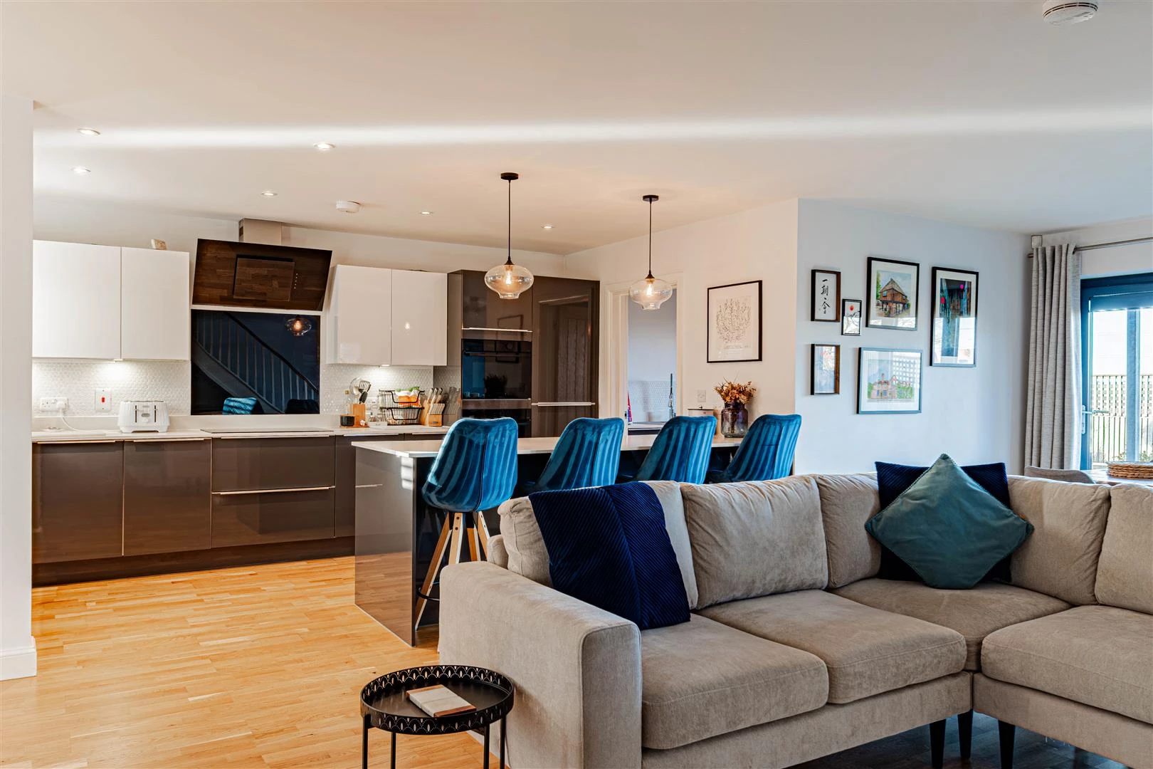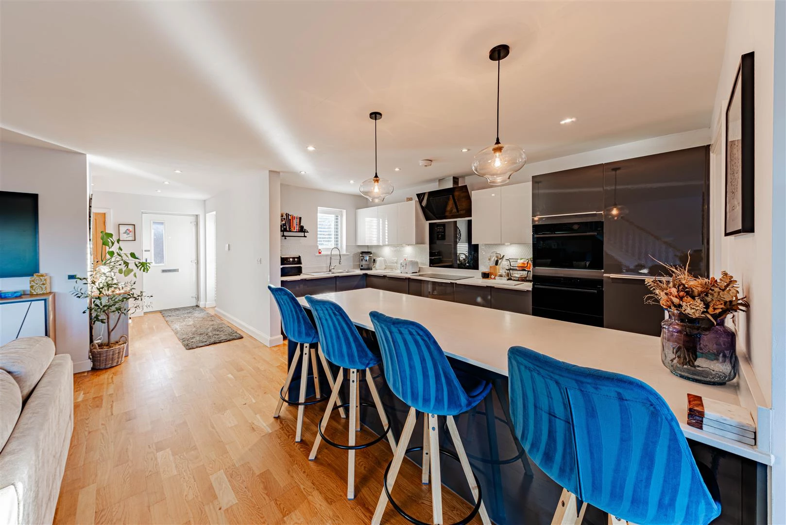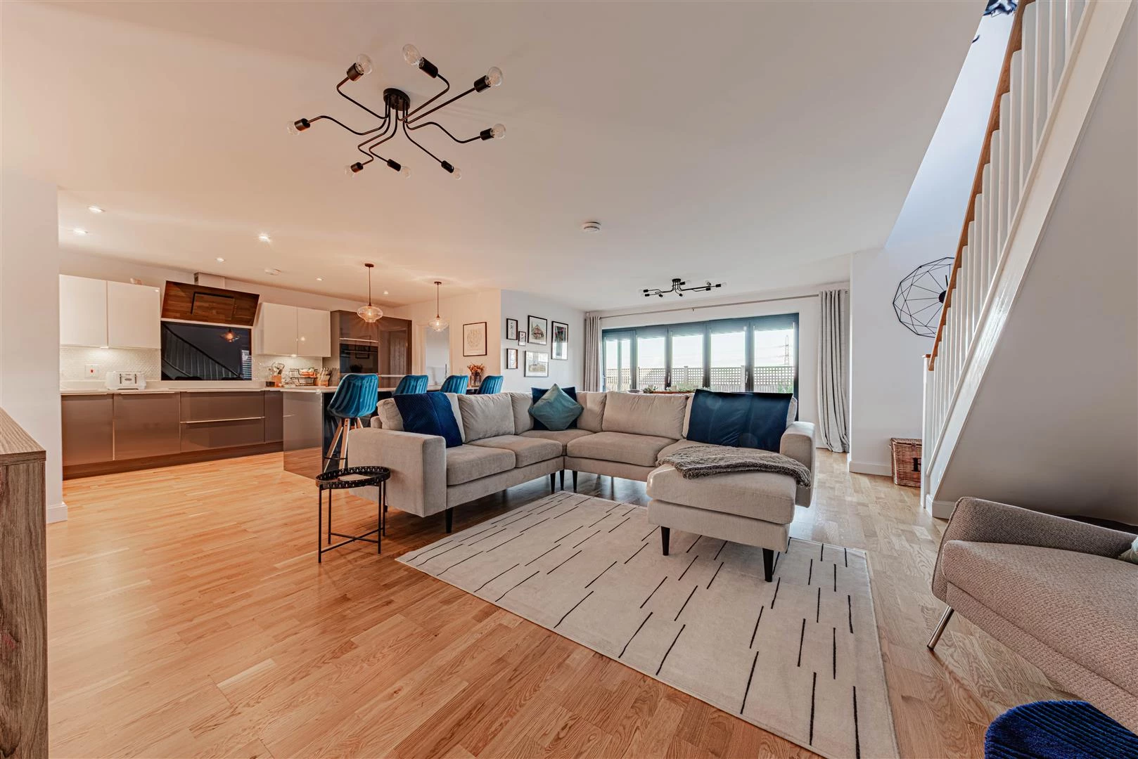 The front door opens into an impressive open-plan kitchen, dining and living space, creating a superb environment for both family life and entertaining. The contemporary kitchen is fitted with gloss units, quartz worktops and a range of integrated appliances, complemented by a separate utility room. The living and dining area is flooded with natural light, enhanced by bi-folding doors that open directly onto the landscaped rear garden. To the front of the house there is a dedicated home office, along with a beautifully appointed downstairs cloakroom.
