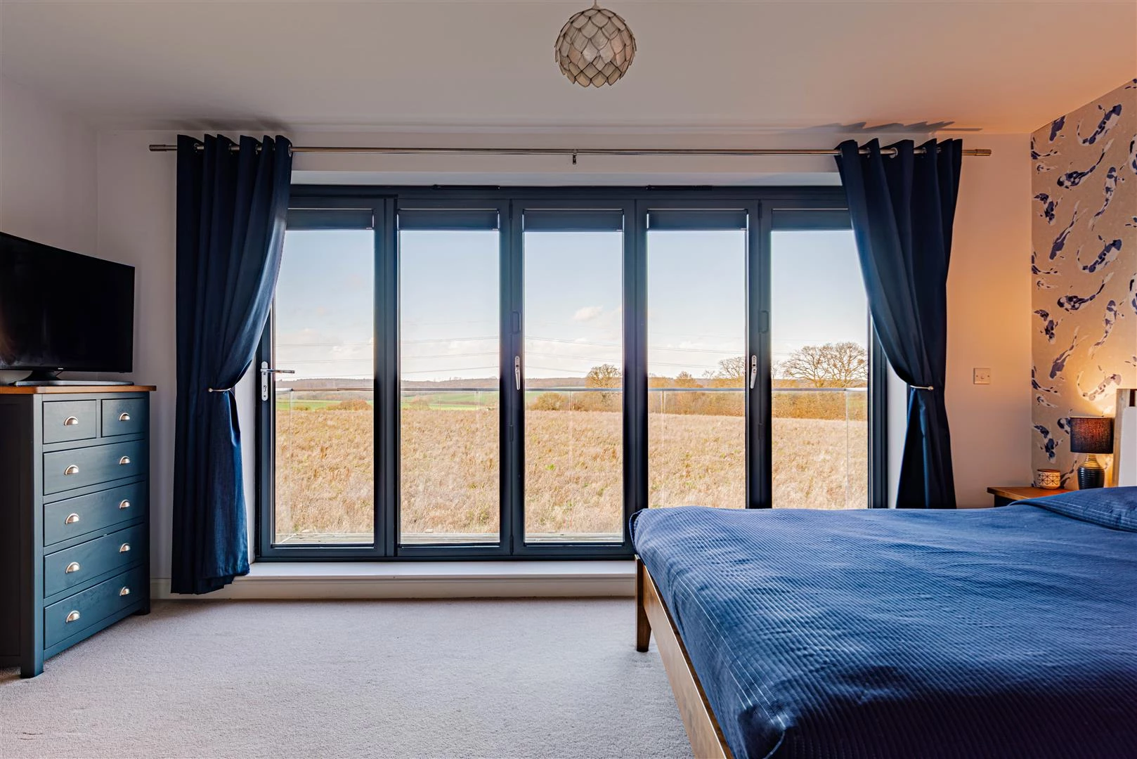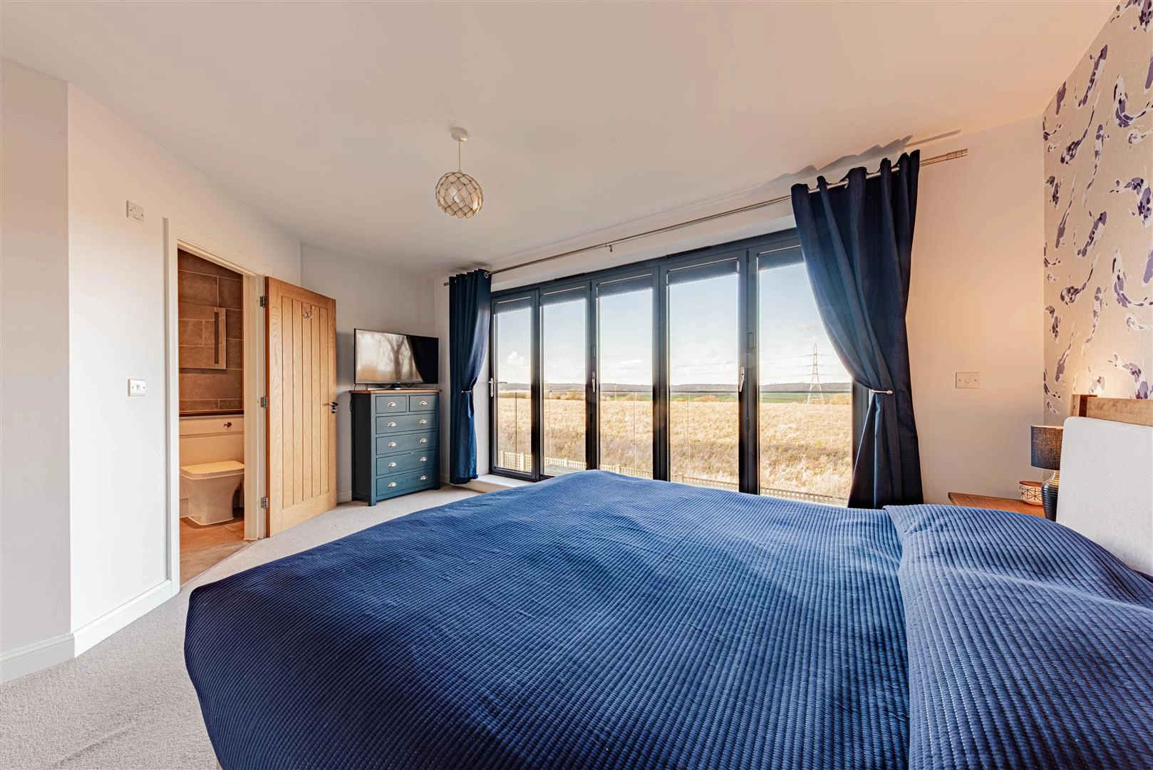 Upstairs, the landing leads to the impressive principal bedroom suite, which features bi-folding doors opening onto a balcony with uninterrupted views across the valley and countryside beyond. The westerly aspect provides breathtaking sunsets. The principal suite also benefits from a walk-in dressing room and a stylish en-suite shower room. There are four further well-proportioned bedrooms, with bedroom two enjoying its own en-suite shower room, in addition to a contemporary family bathroom.