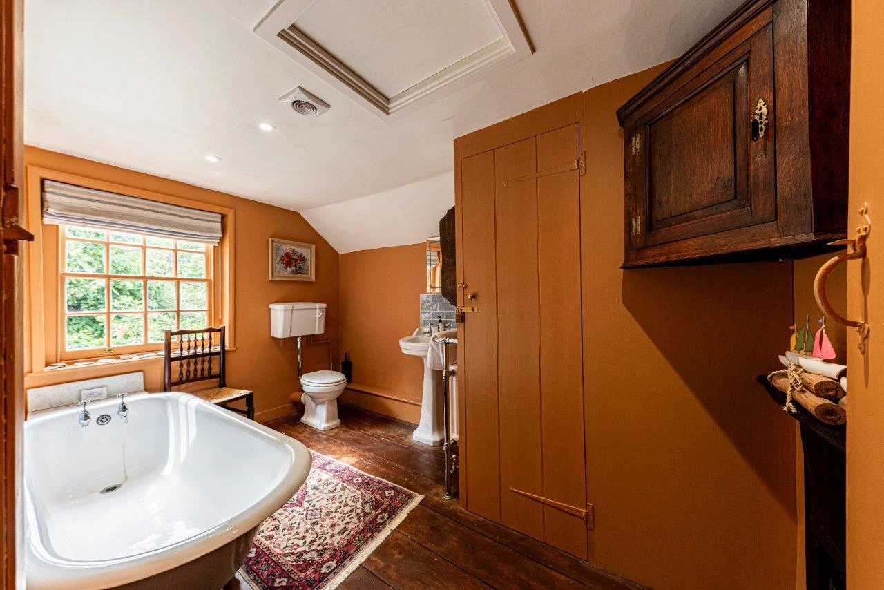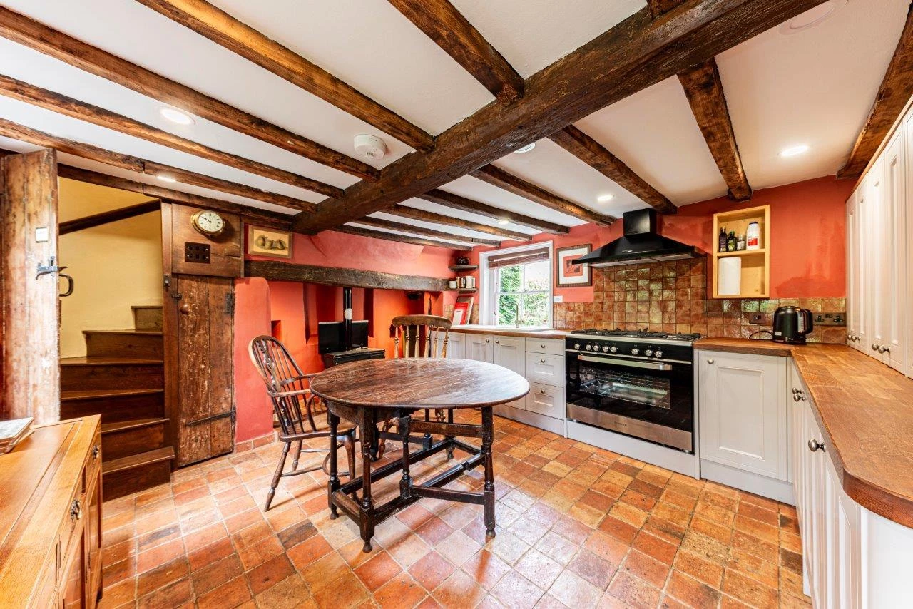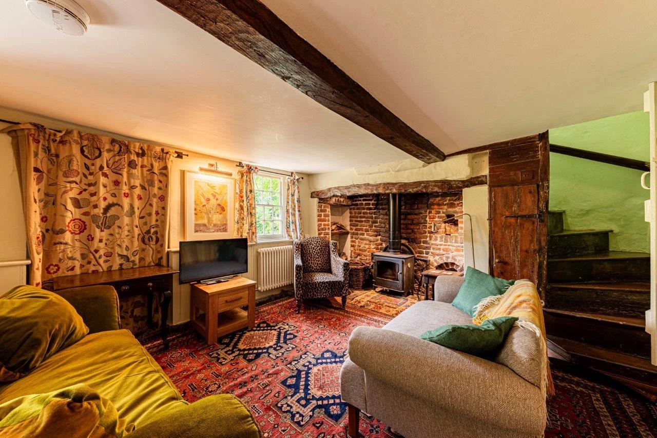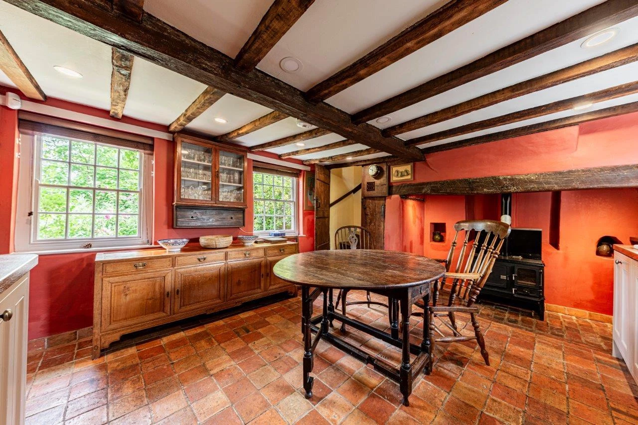 The property offers over 2,600 sq ft of accommodation, including five double bedrooms, three reception rooms, and a large kitchen/breakfast room. The ground floor features a spacious living room with exposed beams, engineered oak flooring, and a magnificent inglenook fireplace housing a contemporary log burner. The sitting room benefits from a second, working log burner dating to 1910, and the separate dining room opens directly to the gardens, making it ideal for entertaining.
