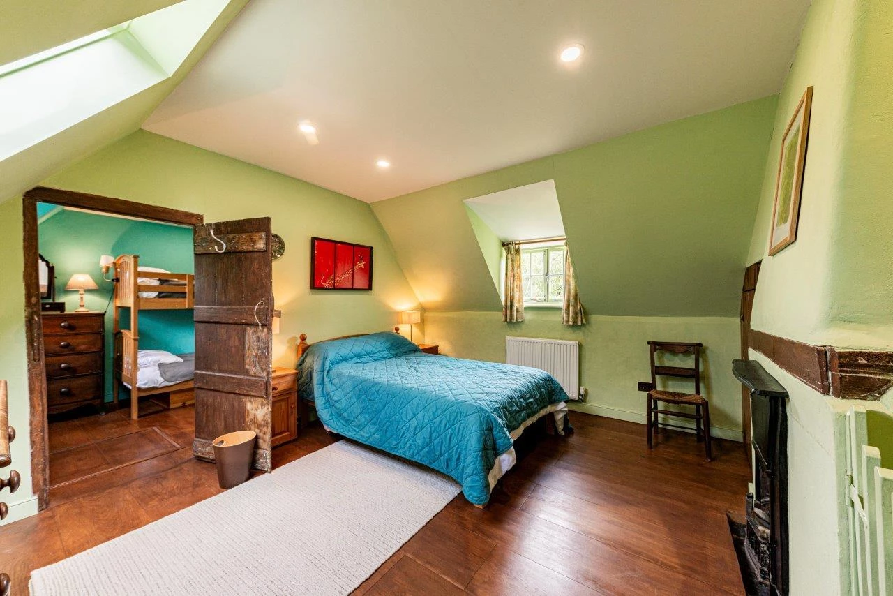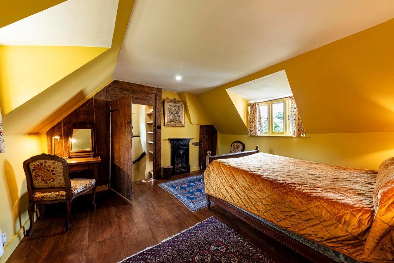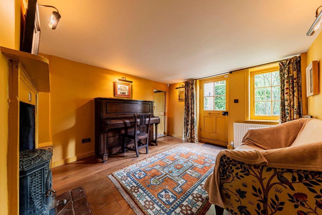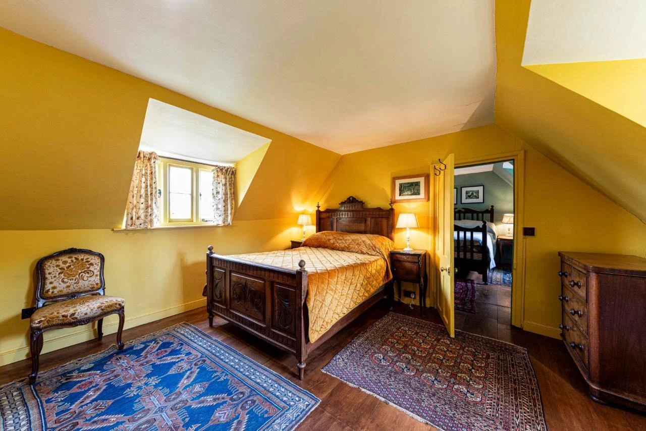 The property offers over 2,600 sq ft of accommodation, including five double bedrooms, three reception rooms, and a large kitchen/breakfast room. The ground floor features a spacious living room with exposed beams, engineered oak flooring, and a magnificent inglenook fireplace housing a contemporary log burner. The sitting room benefits from a second, working log burner dating to 1910, and the separate dining room opens directly to the gardens, making it ideal for entertaining.