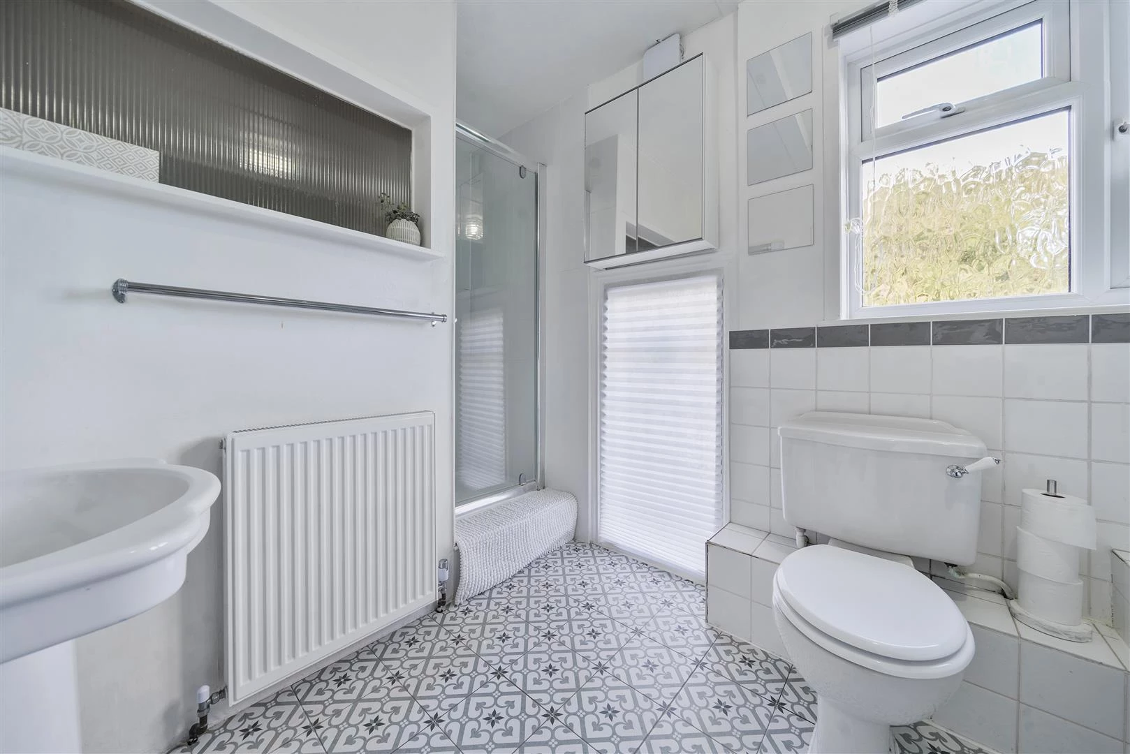 Upstairs, there are three comfortable bedrooms, two with built-in storage, and a stylish family bathroom with a modern white suite including a bath, separate shower, WC and wash hand basin.