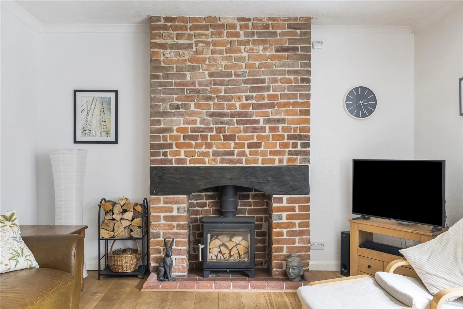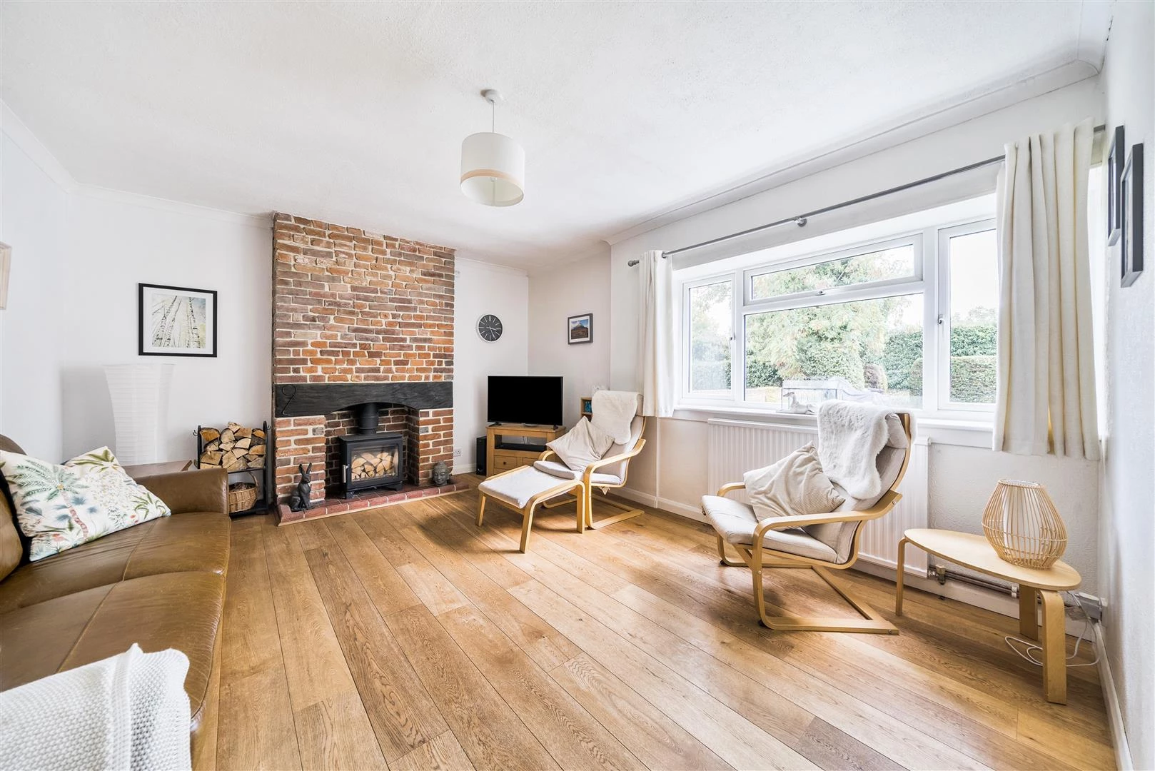 Set back from the road behind its pretty front garden and off-road parking, the front door opens to the porch and thought to the sitting room with timber flooring and a lovely exposed brick fireplace, complete with a wood-burning stove.