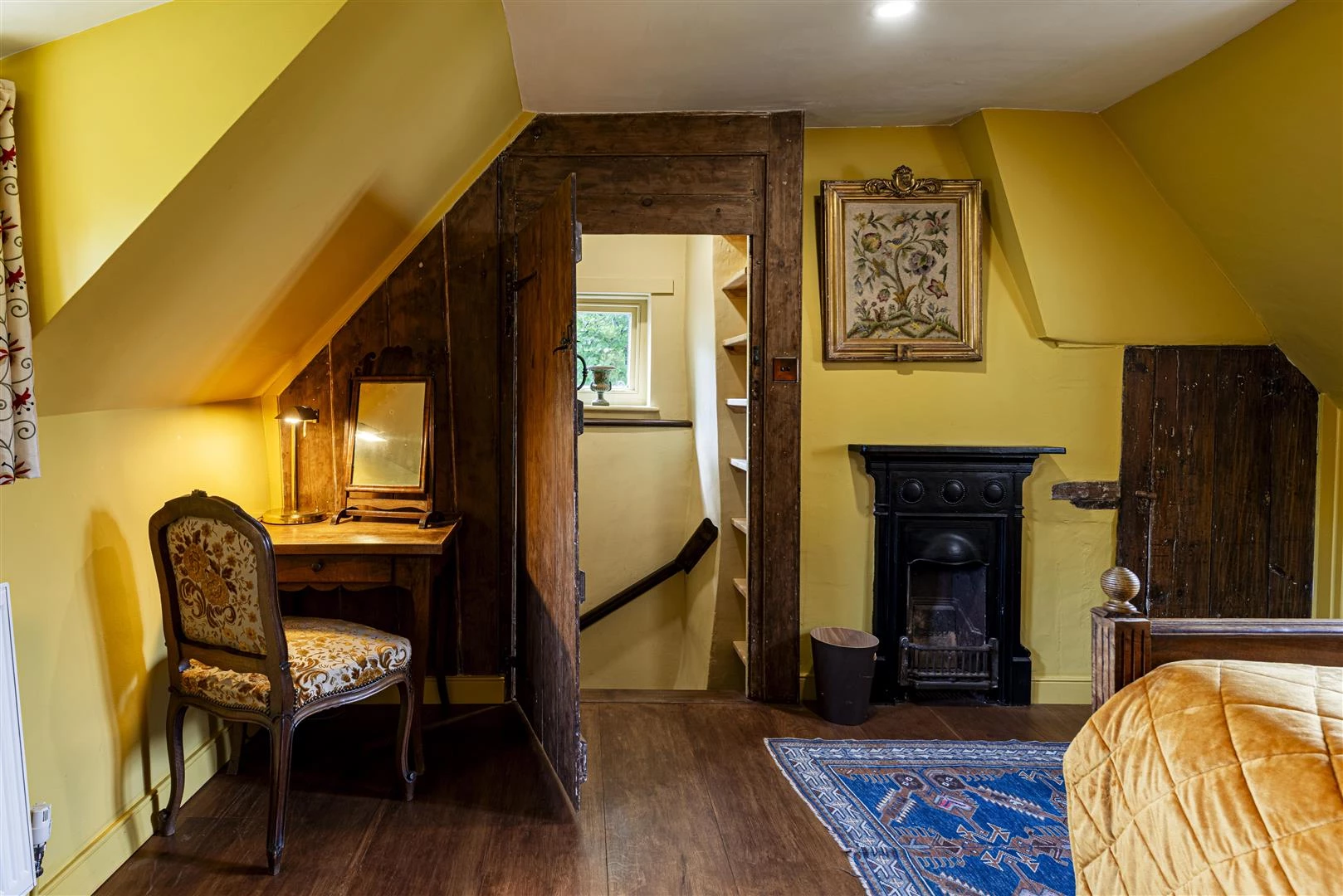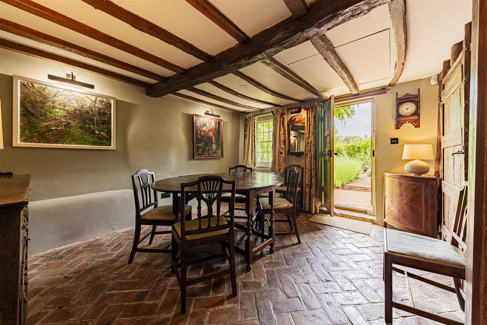 The property offers over 2,600 sq ft of accommodation, including five double bedrooms, three reception rooms, and a large kitchen/breakfast room. The ground floor features a spacious living room with exposed beams, engineered oak flooring, and a magnificent inglenook fireplace housing a contemporary log burner. The sitting room benefits from a second, working log burner dating to 1910, and the separate dining room opens directly to the gardens, making it ideal for entertaining.